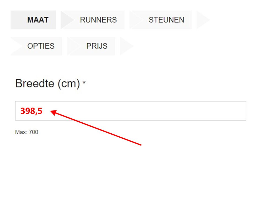 U meet van wand tot wand 400 cm. Dan haalt u 1,5 cm van de breedte af en besteld de gordijnrails op 398,5 cm. Dit is de maat die u aan ons opgeeft.