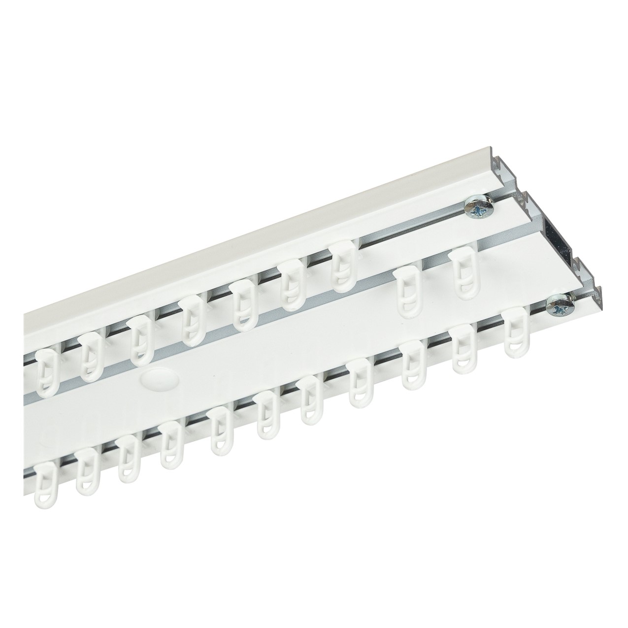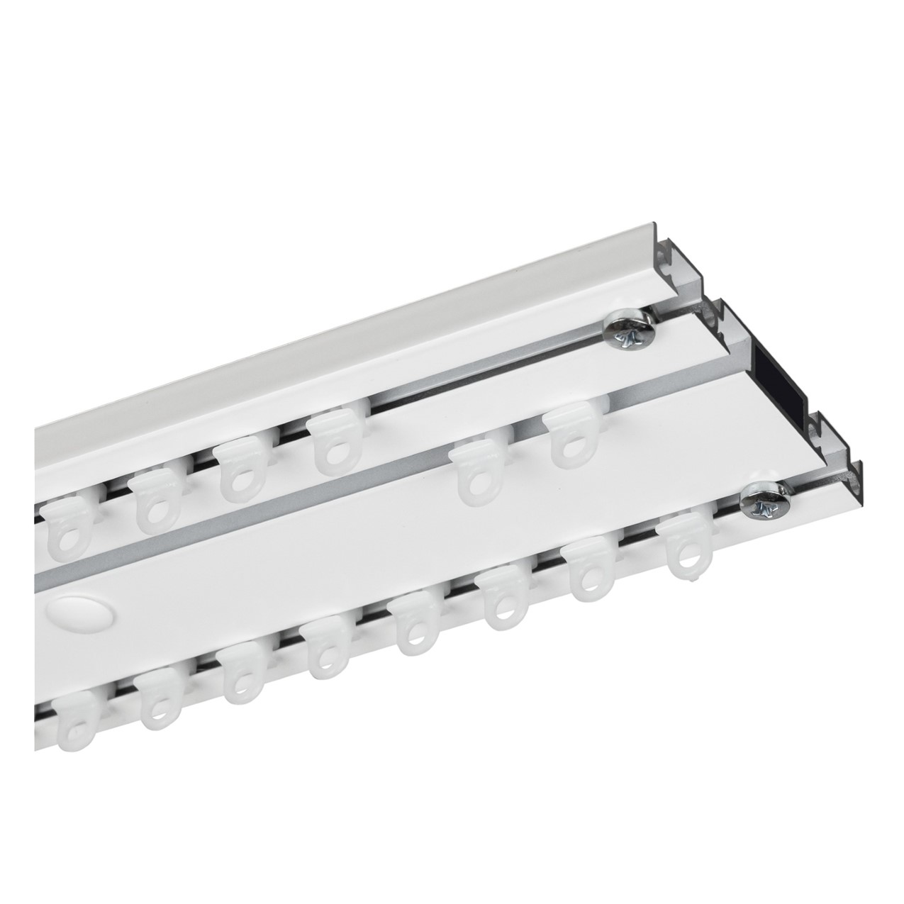 Zoek je een professionele gordijnrails voor meerdere lagen gordijnen? De CADEFO driesporen gordijnrails is speciaal ontwikkeld voor situaties waar je vitrage, overgordijnen én verduistering wilt combineren. Dit systeem biedt hotelkwaliteit voor thuis en wordt tot 6 meter uit één stuk geleverd, zonder koppelstukken of onderbrekingen. Door de strakke plafondmontage en afwerking met schroefkapjes oogt de rails rustig en stijlvol in ieder interieur.